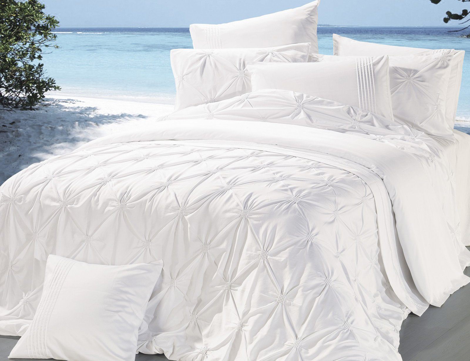 Самый оригинальный комплект в коллекции. Смелое дизайнерское решение – стянутая резиночками изнутри ткань собирается в букле. Расположенные в шахматном порядке букле создают объёмный рисунок. Эластичность резинок позволяет без труда отгладить комплект после стирки.