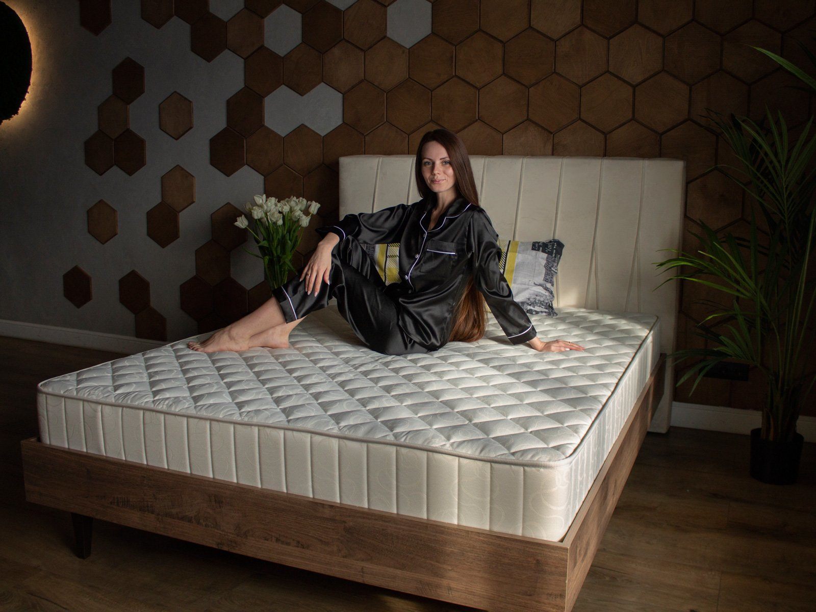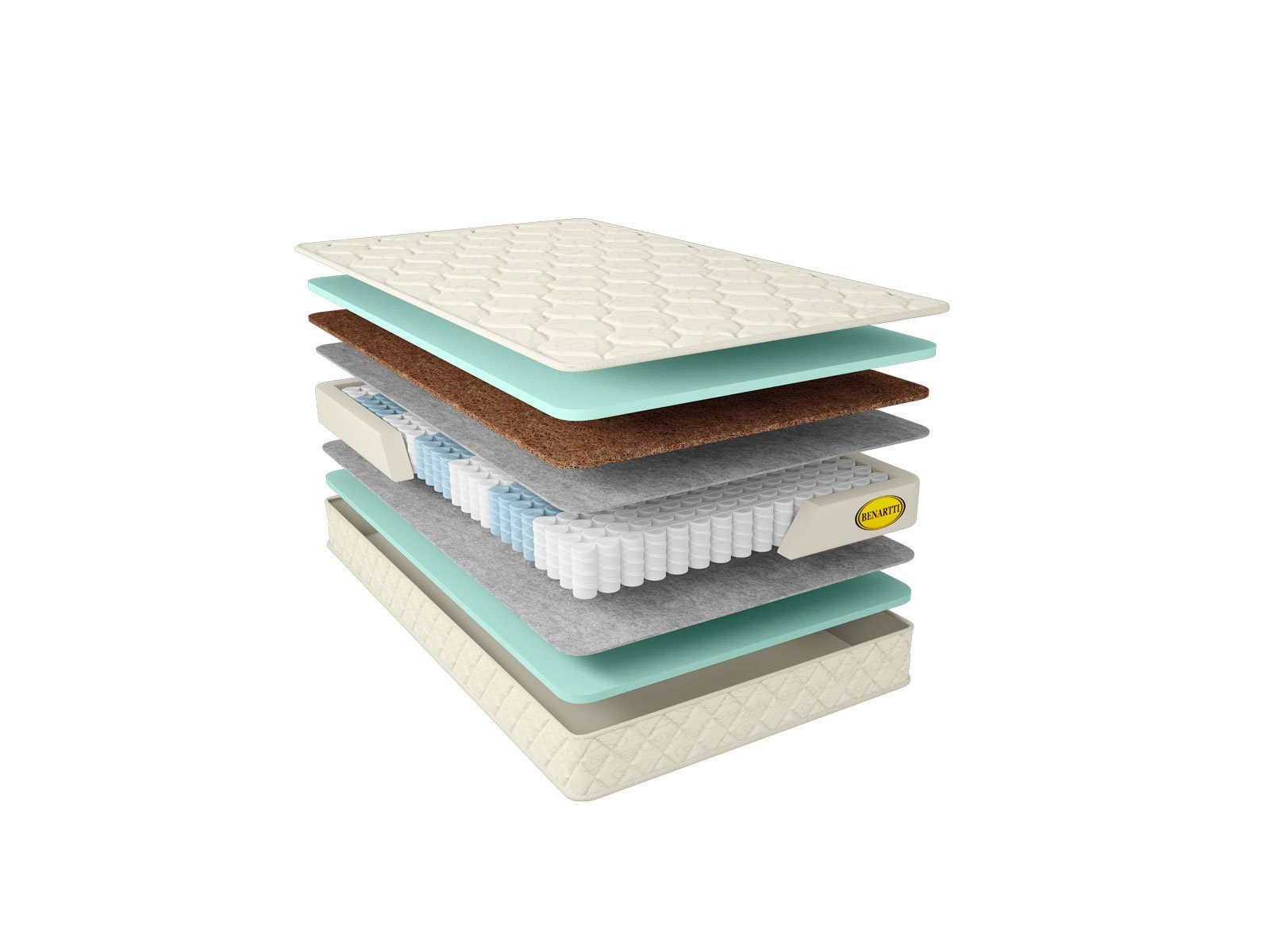 Чехол матраса изготавливается из прочного жаккарда в универсальном молочном цвете. Пышный облик изделия обеспечивается холлконом, на котором и осуществляется стёжка. Он хорошо держит объём и форму даже спустя многие годы эксплуатации.