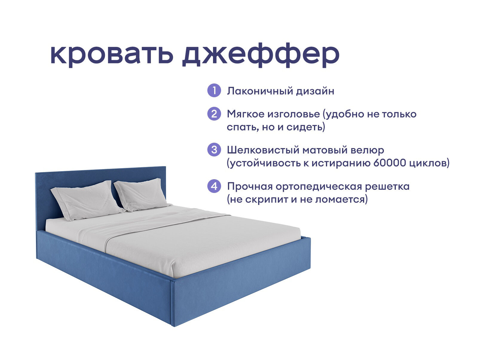 Выполнена в стиле минимализм. Простой, но выразительный образ отличается эргономичностью конструкции и особенным комфортом в эксплуатации. Компактное изголовье легко впишется в самые смелые решения. Конструкция кровати изготовлена из ДСП, обивка из велюра. В комплект входит ортопедическое металлическое разборное основание.