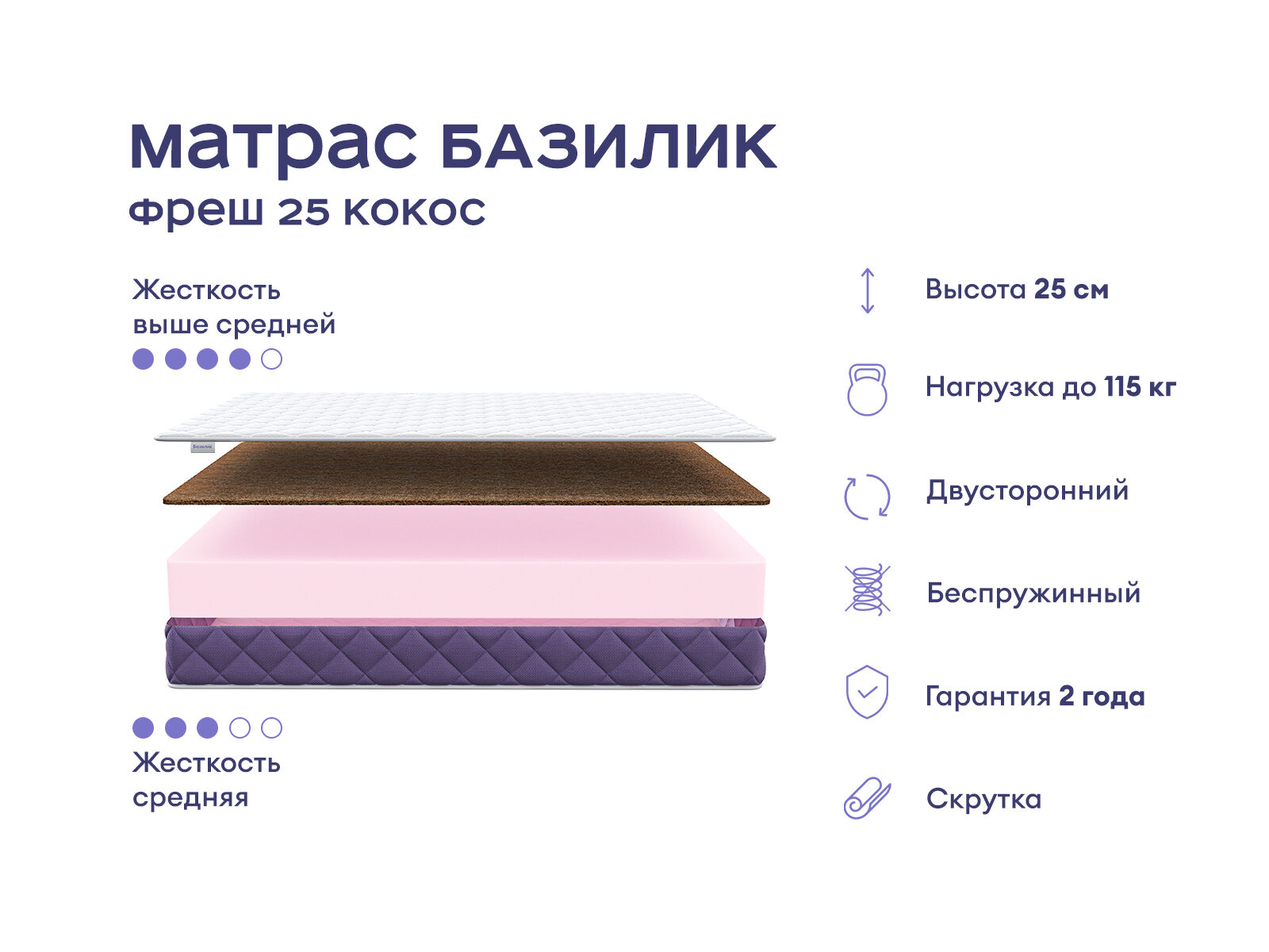 Матрас создает идеальное сочетание комфорта и поддерживающих свойств, подходящее для любого спального места. С двумя уровнями жёсткости и гипоаллергенными материалами модель обеспечивает здоровый и уютный отдых. Прочность и устойчивость усиливаются благодаря беспружинному наполнению. С этим матрасом ваш сон станет комфортным и здоровым, как если бы вы отдыхали на юге Франции.