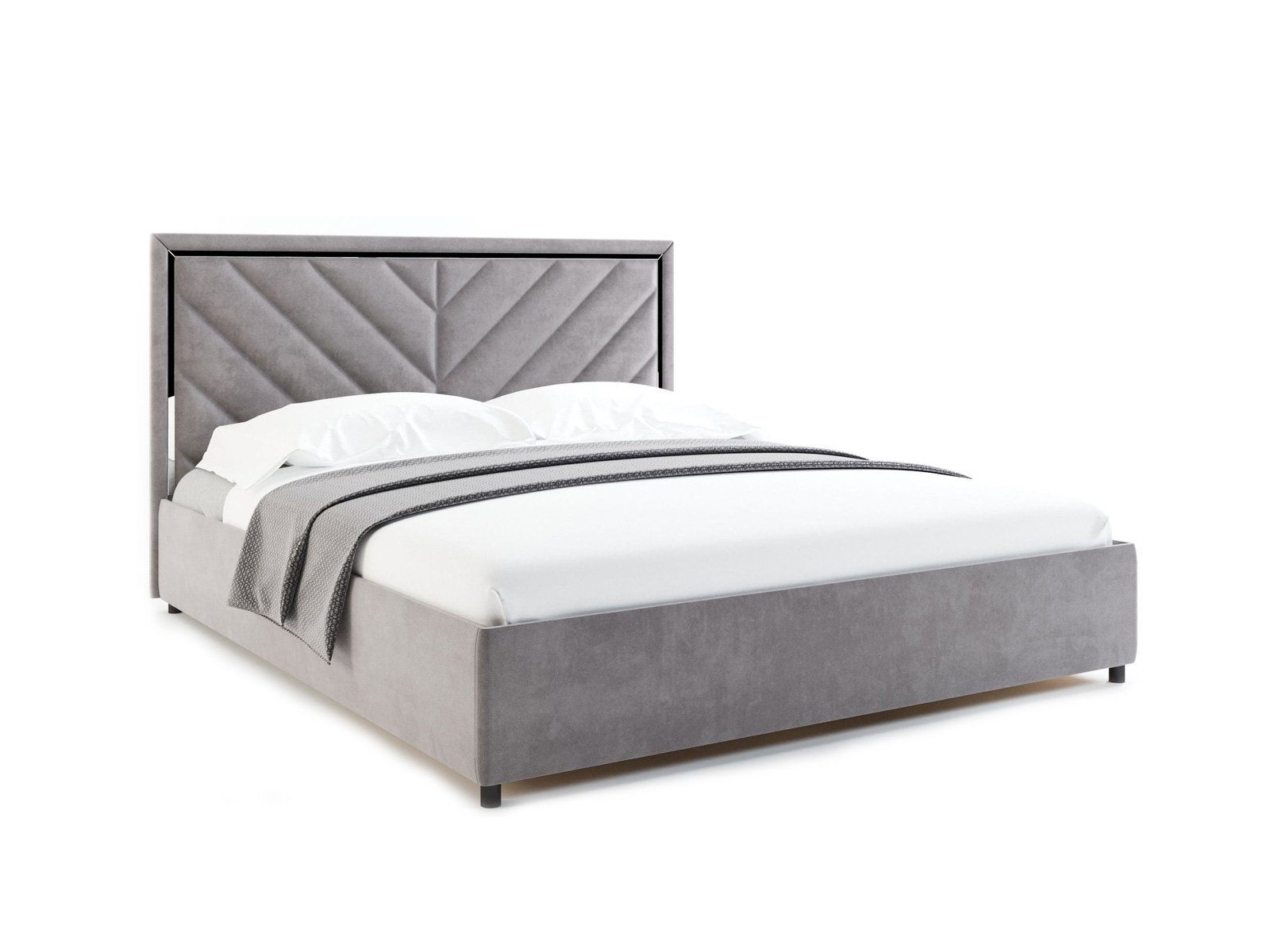 Виктория — кровать с высоким изголовьем в современном стиле. Изюминка модели — высокое мягкое изголовье с диагональными стяжками и зеркальной вставкой по периметру, которая создает яркие блики на свету.
