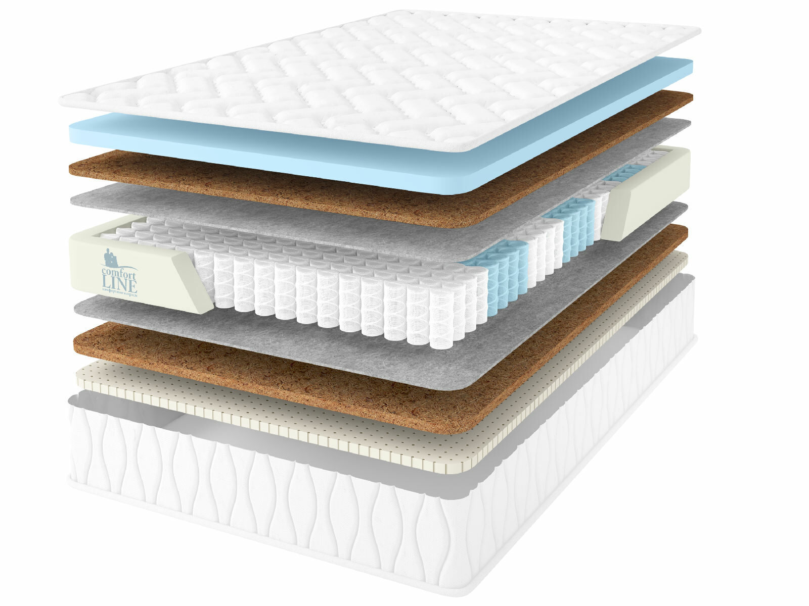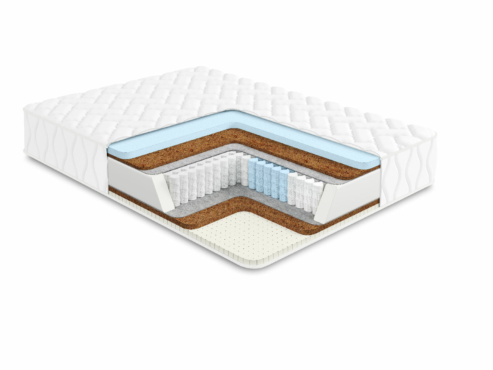 Средне-жёсткая сторона представлена слоями натуральных койры и латекса. Данные наполнители обеспечивают и ортопедичность, и анатомичность. Другая сторона – умеренно- жёсткая, она проложена ортопедической пеной и койрой. Пена весьма схожа по свойствам с натуральным латексом, но имеет более высокую плотность и твёрдость.