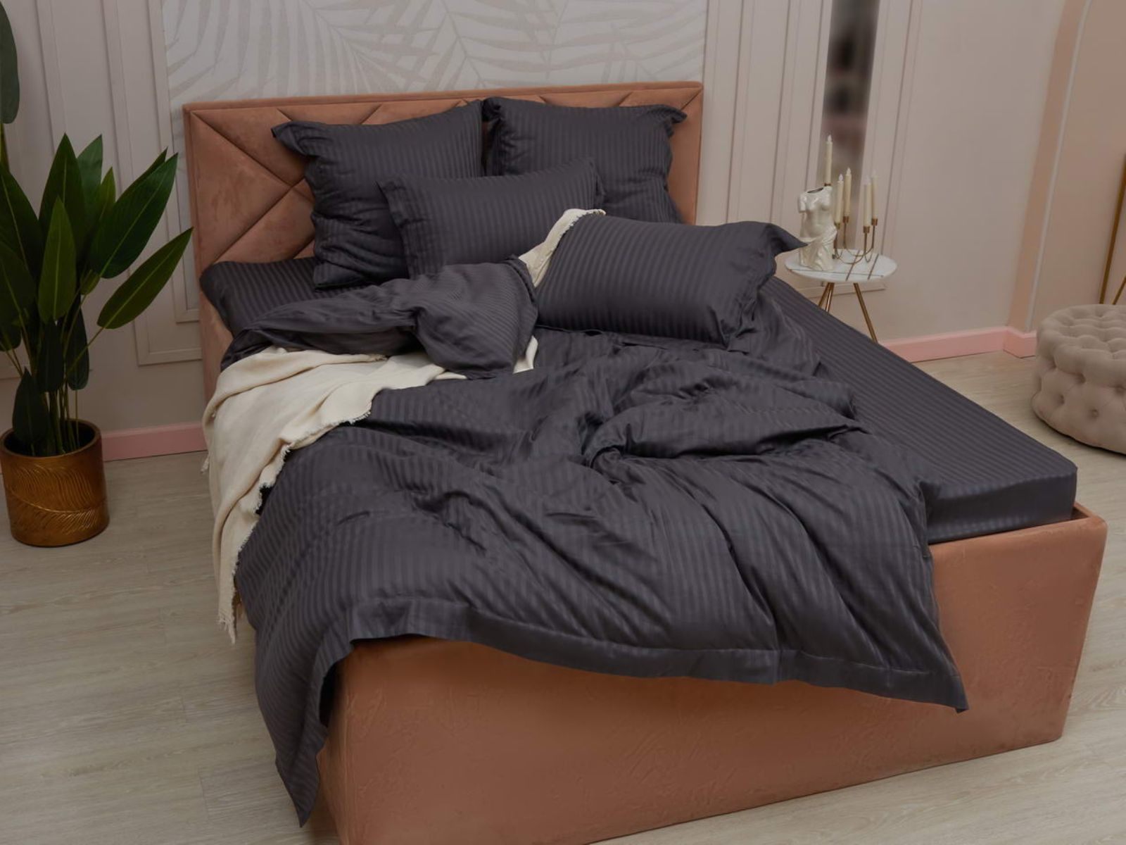 Постельное белье Моне, изготовленное из высококачественного страйп-сатина, станет украшением Вашей спальни. Комплекты представлены в 17 оттенках: от пастельных, до ярких насыщенных тонов. Такая палитра никого не оставит равнодушным. Особое плетение ткани образует узор в виде чередующихся полос, это придает постельному белью изысканность, гладкость и блеск.