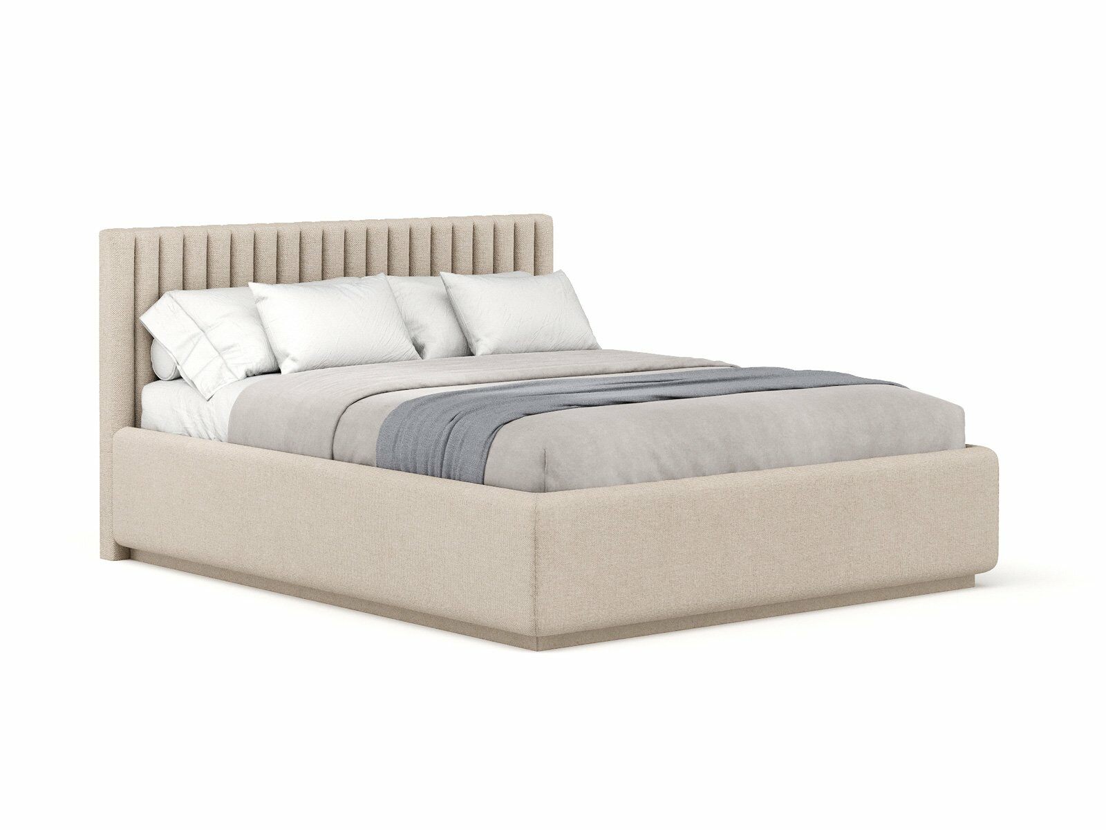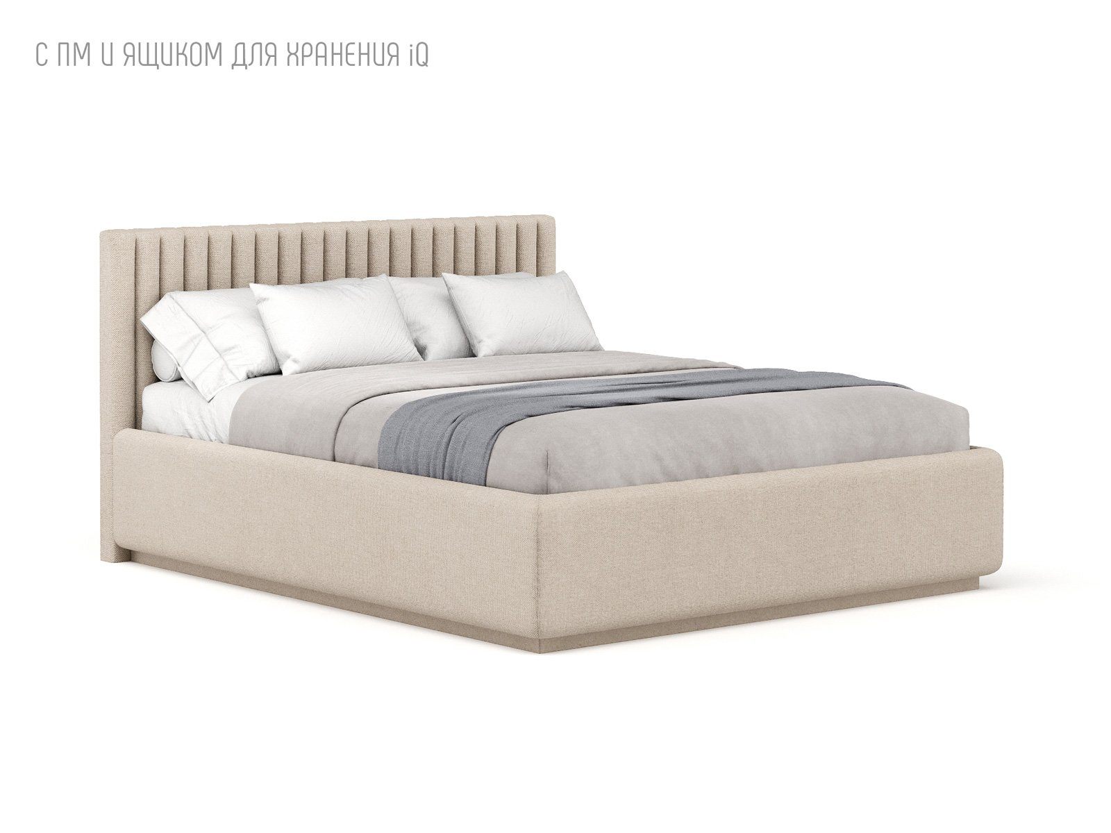 Кровать укомплектована IQ с подъемным механизмом и ящиком для белья без дна (дополнительная платная опция - дно к ящику IQ из HDF (ХДФ). Каркас кровати на цоколе, декоративный чехол на цоколе съёмный. Глубина ящика для белья - 30 см, без ограничения нагрузки на ящик.
