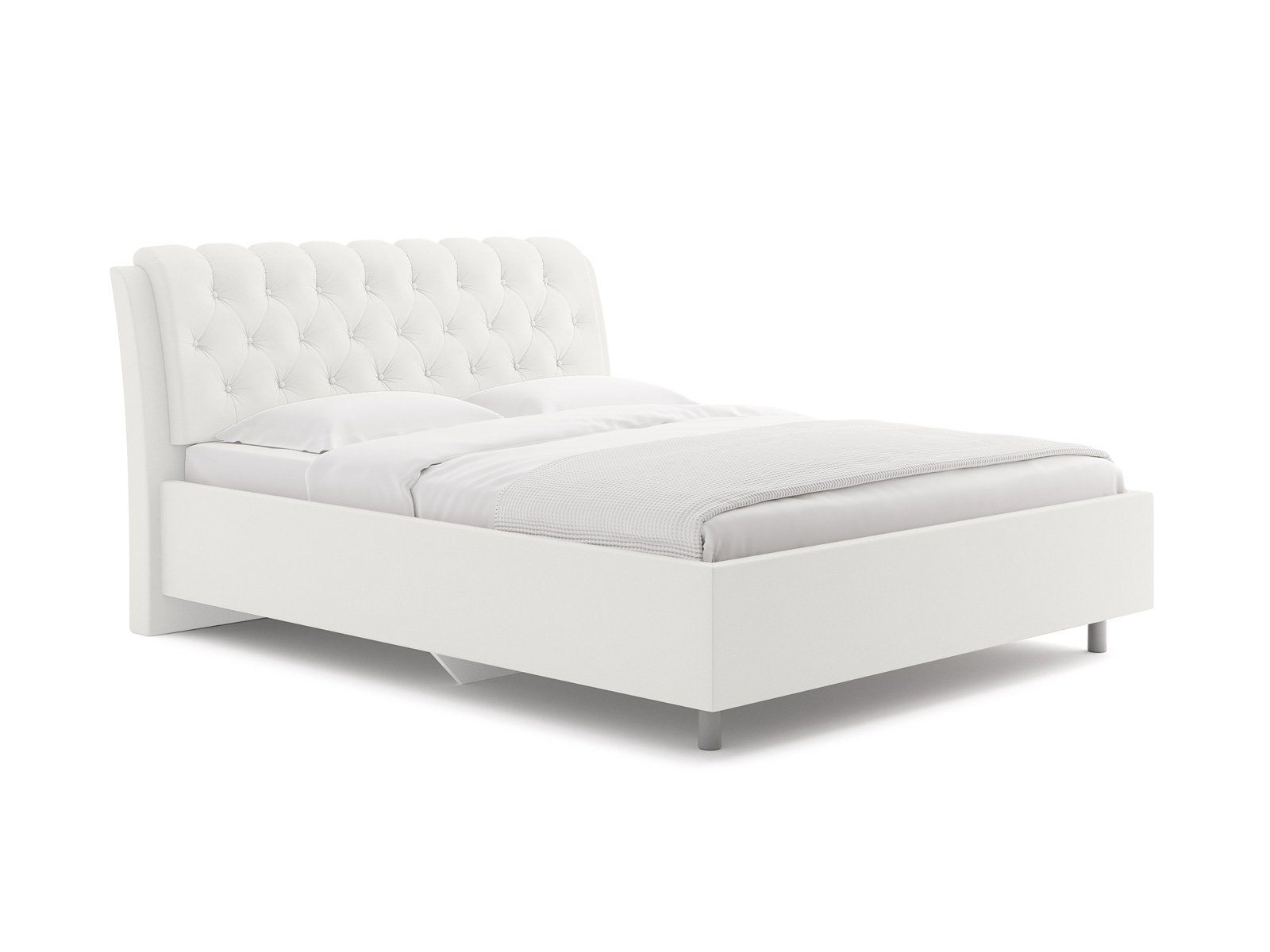 Элегантная интерьерная кровать с изголовьем, украшенным декоративными пуговицами и глубокой пиковкой. Модель изготовлена из ДСП.