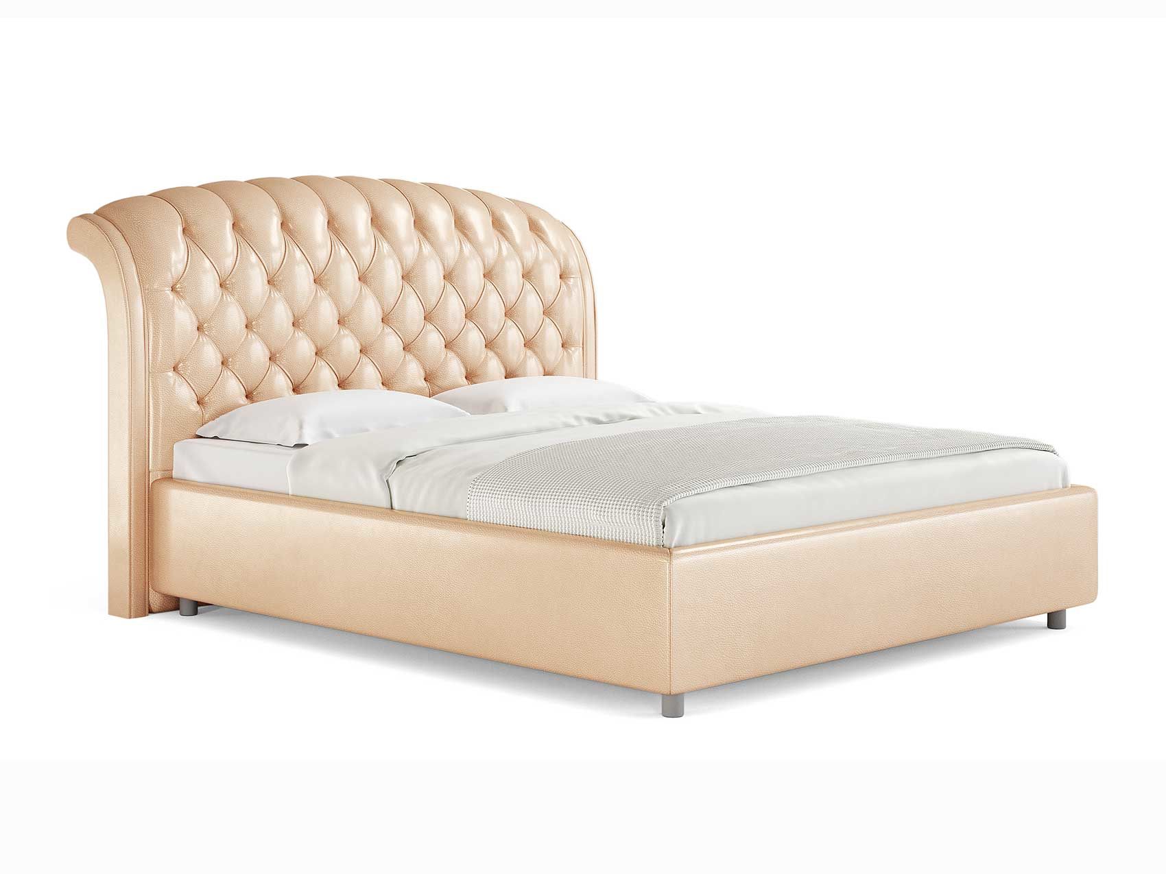 Стильная интерьерная кровать из экокожи с изогнутым изголовьем и широкими царгами. Модель изготовлена из ДСП.
