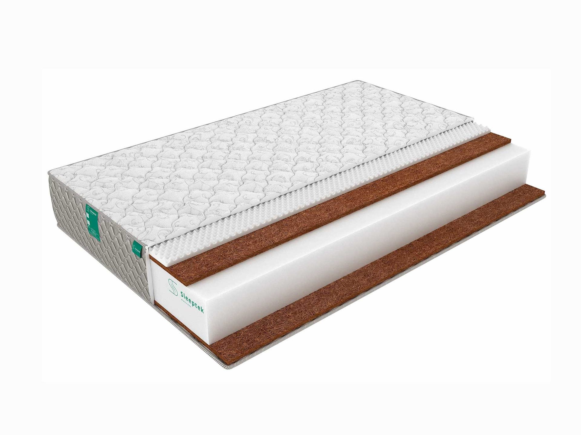 По сторонам от блока расположились сантиметровые полотна кокоса. Они играют роль поддерживающего слоя. Материал отличается высокой плотность и жёсткостью, но при этом он достаточно гибок для того, чтобы дублировать линии фигуры, поэтому правильная опора – его главная функция в матрасе.