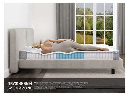 Матрас сочетает в себе натуральные и синтетические наполнители для сбалансированной жёсткости, поддерживает правильную осанку за счёт пружинной системы 3 Zone и добавляет мягкости и комфорта благодаря обивке 4D Original.