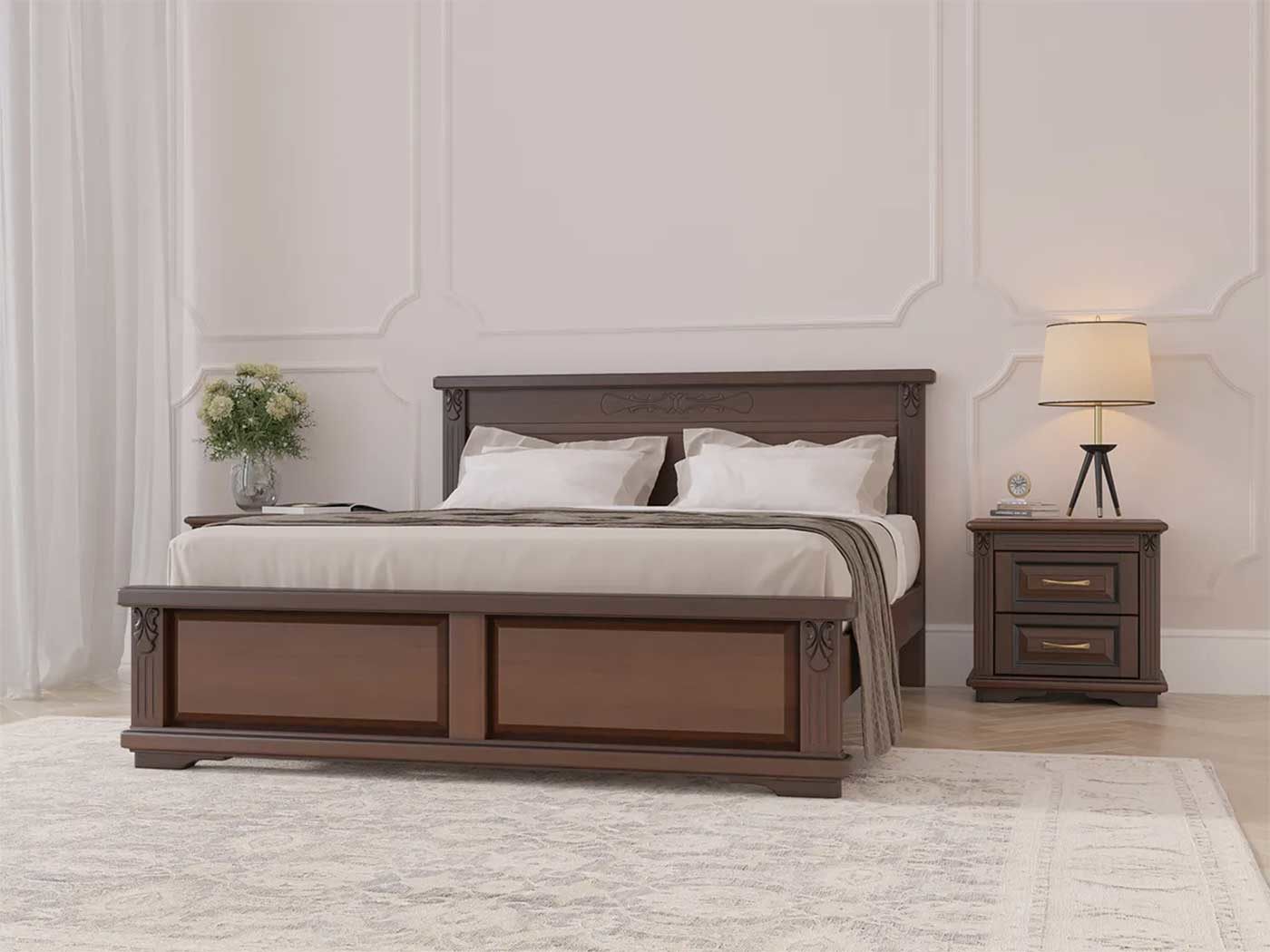 Деревянная кровать Палермо производится из массива ясеня. Элементами декора этой модели являются резьбовые элементы из натурального дерева, выполненные на высокотехнологичном оборудовании. Фундаментальность линий современной классики в сочетании с безупречным качеством изготовления и покраски — вот, что позволяет этой модели кровати, уверенно занимать лидирующие позиции на российском рынке в премиальном сегменте мебели.