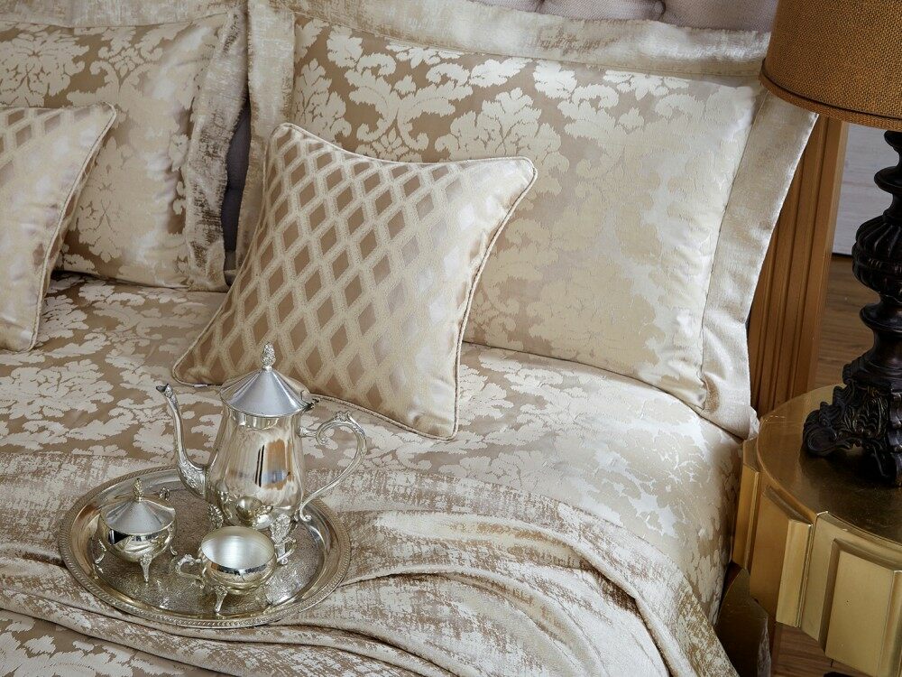 Роскошное покрывало с классическим итальянским рисунком бежевого цвета на теплом золотистом фоне.