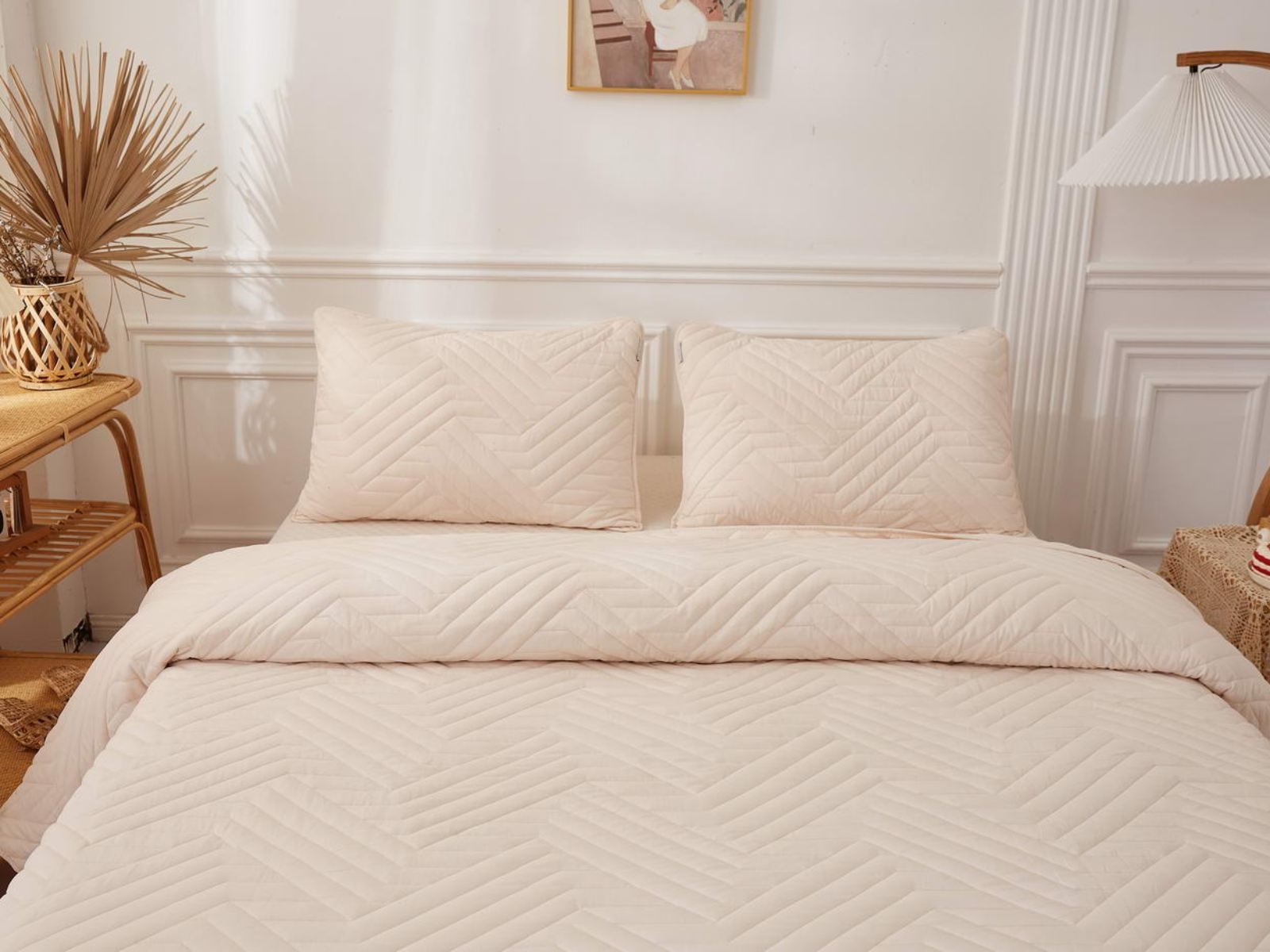 В комплект входят покрывало и одна либо две наволочки (50х70 см) из аналогичного материала в зависимости от размера. Изделия гипоаллергенны, они подходят детям и людям с чувствительной кожей. Покрывала и наволочки не линяют, сохраняют форму и цвет при многочисленных стирках и не выгорают на солнце. Изделия можно стирать в щадящем режиме при температуре не выше 30 градусов.