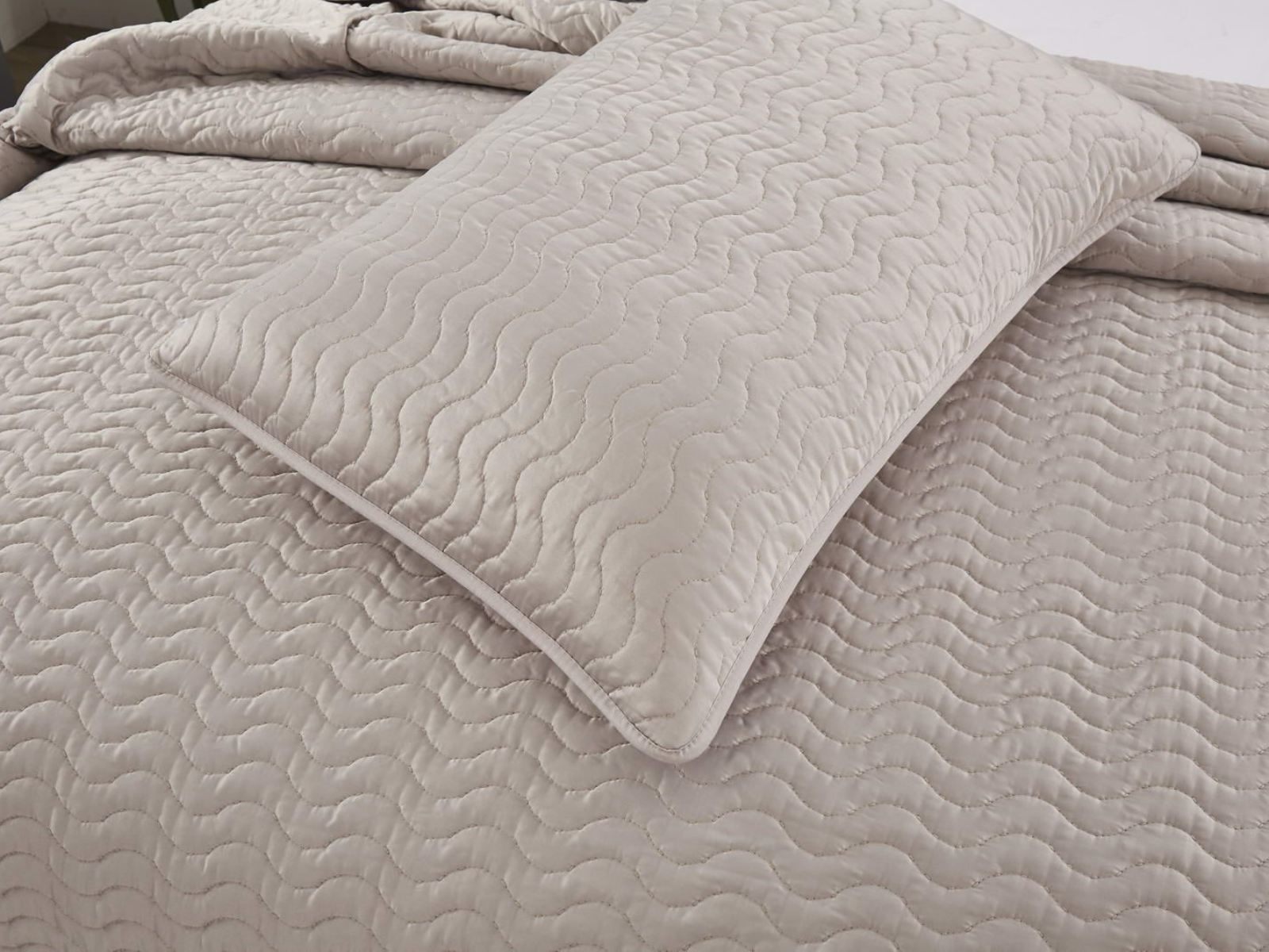 Коллекцию характеризуют сдержанные цвета с широкой палитрой сочетаний: серый, стоун, пудра, кофе, лаконичный волнистый узор, выступающий над поверхностью ткани, объёмная фактура, мягкость и гладкость атласного материала, деликатный кант по периметру изделия.